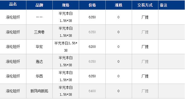 1.4D半光直紡滌綸短纖江浙商談重心6300-6500元/噸出廠或短送,福建主流商談6300-6450元/噸現(xiàn)款短送,山東、河北主流6400-6600元/噸送到。