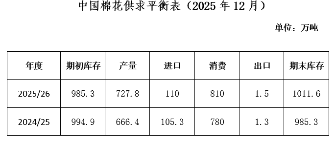 12月26日,國家統(tǒng)計局公布2025年全國棉花產(chǎn)量664.1萬噸,同比增長7.7%。其中新疆產(chǎn)量616.5萬噸,增長8.4%;長江流域22.0萬噸,下降0.7%;黃河流域20.3萬噸,下降1.5%。中國棉花協(xié)會預(yù)測,2025/26年度全國棉花產(chǎn)量727.8萬噸,同比增長9.2%;進口量110萬噸,同比增長4.5%;消費量810萬噸,同比增長3.8%;期末庫存1011.6萬噸,同比增長2.7%。
