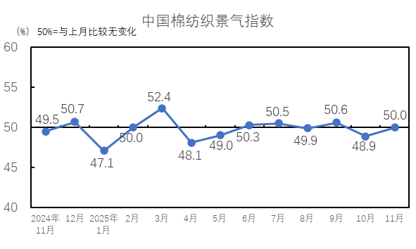 2025年11月,生產(chǎn)指數(shù)為50.9%,高于臨界點,較10月上升2.5個百分點,紡織廠生產(chǎn)較10月上升。從分項指數(shù)看,棉紡織廠設備開臺率指數(shù)為50.1%,高于臨界點,較10月上升0.8個百分點。紗產(chǎn)量指數(shù)為50.3%,較10月上升1.9個百分點;布產(chǎn)量指數(shù)為53.8%,較10月上升7.5個百分點;紗產(chǎn)量指數(shù)和布產(chǎn)量指數(shù)均高于臨界點。