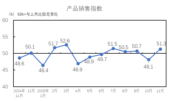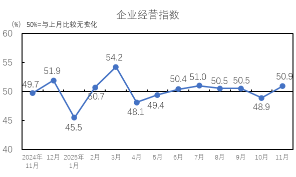 2025年11月,企業(yè)經(jīng)營指數(shù)為50.9%,高于臨界點,較10月上升2.0個百分點。11月,因今年氣候降溫較晚,傳統(tǒng)旺季局面得到一定程度延續(xù),下游市場韌性仍存,部分紡企訂單可排產(chǎn)至12月底,市場整體呈“淡季不淡”態(tài)勢,企業(yè)經(jīng)營好轉(zhuǎn)。從構(gòu)成企業(yè)經(jīng)營指數(shù)的分項指標看,營業(yè)收入指數(shù)為51.5%,較10月上升4.1個百分點;利潤總額指數(shù)為50.3%,較10月下降0.1個百分點,營業(yè)收入指數(shù)和利潤總額指數(shù)均高于臨界點。