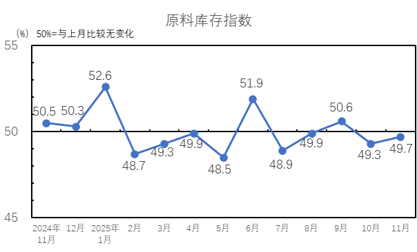 2025年11月,原料庫存指數(shù)為49.7%,低于臨界點,較10月上升0.4個百分點,行業(yè)主要原料庫存量下降。11月,紡織廠棉花庫存上升,棉花庫存量指數(shù)為50.9%,較10月上升1.8個百分點;紡織廠非棉纖維庫存下降,非棉纖維庫存量指數(shù)為48.5%,較10月下降0.9個百分點。棉花庫存量指數(shù)高于臨界點,非棉纖維庫存量指數(shù)低于臨界點。