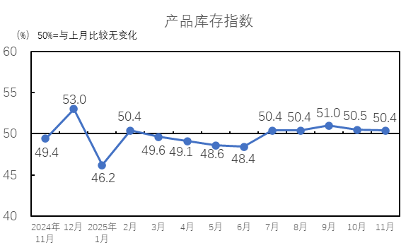 2025年11月,產(chǎn)品庫存指數(shù)為50.4%,高于臨界點,較10月下降0.1個百分點,紡織廠產(chǎn)品庫存量下降。紗庫存量指數(shù)為51.0%,較10月上升1.4個百分點;布庫存量指數(shù)為49.4%,較10月下降2.5個百分點。紗庫存量指數(shù)高于臨界點,布庫存量指數(shù)低于臨界點。