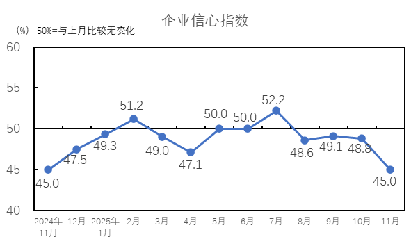 2025年11月,企業(yè)信心指數(shù)為45.0%,較10月下降3.8個百分點,企業(yè)信心指數(shù)低于臨界點,對未來市場的信心不足。11月,雖市場維持“淡季不淡”態(tài)勢,但整體交投氛圍逐漸轉(zhuǎn)淡,隨著紡織傳統(tǒng)淡季深入,未來市場將進一步縮減,企業(yè)對未來行情的預期降低。