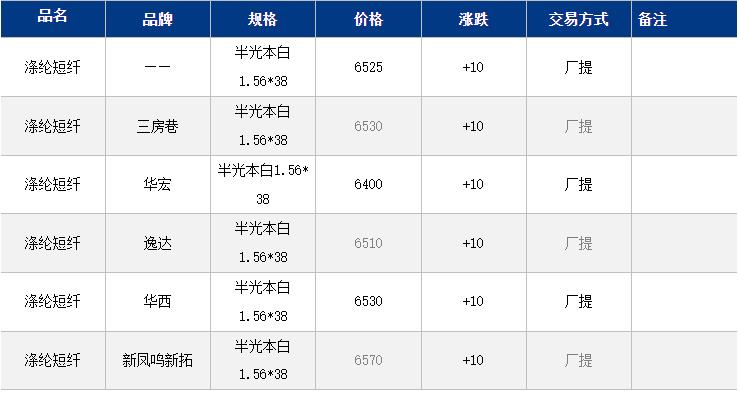 1.4D半光直紡滌綸短纖江浙商談重心6400-6600元/噸出廠或短送,福建主流商談6450-6600元/噸現(xiàn)款短送,山東、河北主流6500-6750元/噸送到。