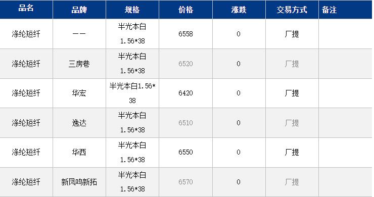 1.4D半光直紡滌綸短纖江浙商談重心6400-6600元/噸出廠或短送,福建主流商談6450-6600元/噸現(xiàn)款短送,山東、河北主流6500-6750元/噸送到。