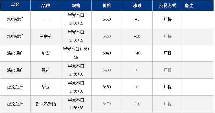 江蘇滌綸短纖現(xiàn)貨價格上漲5元至6440元/噸;目前江蘇主流6400-6500元/噸自提,偏低貨源6340元/噸附近。
