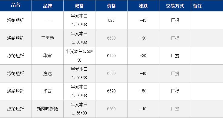 江蘇滌綸短纖現(xiàn)貨價(jià)格上漲45元至6525元/噸;目前江蘇主流6500-6580元/噸自提,偏低貨源6420元/噸附近。