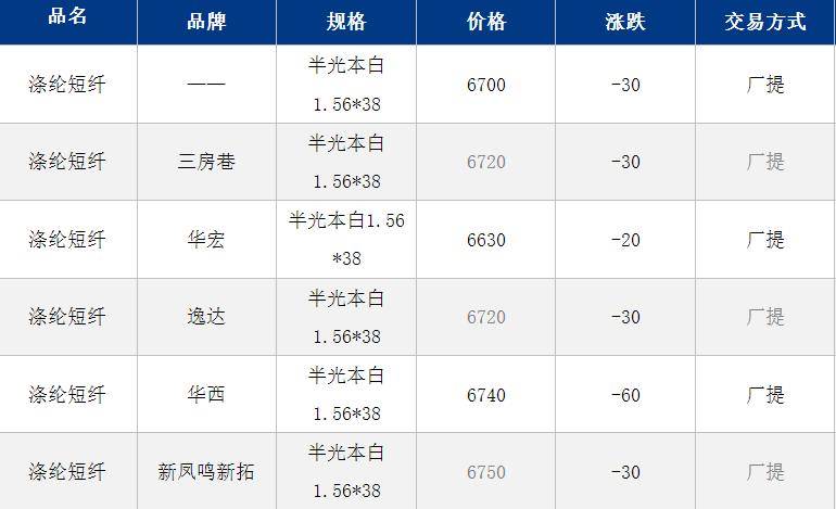 江蘇滌綸短纖現(xiàn)貨價格下跌30元至6700元/噸;需求平淡疊加成本支撐轉(zhuǎn)弱,今日短纖現(xiàn)貨報價有所下滑。目前江蘇主流商談6700-6750元/噸自提,偏低貨源6630元/噸附近。