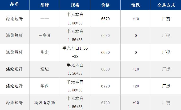 1.4D半光直紡滌綸短纖江浙商談重心6850-6900元/噸出廠(chǎng)或短送,福建主流商談6850-6900元/噸現(xiàn)款短送,山東、河北主流6750-6950元/噸送到。