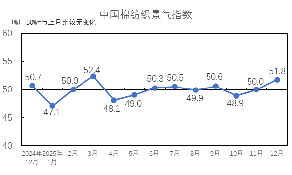 2025年12月,生產(chǎn)指數(shù)為50.9%,高于臨界點(diǎn),較11月持平,紡織企業(yè)生產(chǎn)情況較11月持平。從分項(xiàng)指數(shù)看,棉紡織企業(yè)設(shè)備開臺率指數(shù)為50.1%,高于臨界點(diǎn),較11月持平。紗產(chǎn)量指數(shù)為52.4%,較11月上升2.1個百分點(diǎn);布產(chǎn)量指數(shù)為51.0%,較11月下降2.8個百分點(diǎn);紗產(chǎn)量指數(shù)和布產(chǎn)量指數(shù)均高于臨界點(diǎn)。
