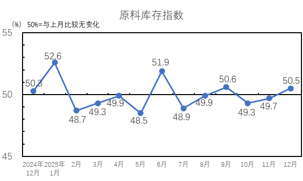 2025年12月,原料庫存指數(shù)為50.5%,高于臨界點(diǎn),較11月上升0.8個百分點(diǎn),行業(yè)主要原材料庫存量上升。12月份,紡織企業(yè)棉花庫存上升,棉花庫存量指數(shù)為50.8%,較11月下降0.1個百分點(diǎn);紡織企業(yè)非棉纖維庫存上升,非棉纖維庫存量指數(shù)為50.3%,較11月上升1.8個百分點(diǎn)。棉花庫存量指數(shù)和非棉纖維庫存量指數(shù)均高于臨界點(diǎn)。