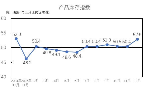 2025年12月,產(chǎn)品庫存指數(shù)為52.9%,高于臨界點(diǎn),較11月上升2.5個百分點(diǎn),紡織企業(yè)產(chǎn)品的庫存量下降。紗庫存量指數(shù)為52.9%,較11月上升1.9個百分點(diǎn);布庫存量指數(shù)為52.9%,較11月上升3.5個百分點(diǎn)。紗庫存量指數(shù)和布庫存量指數(shù)均高于臨界點(diǎn)。
