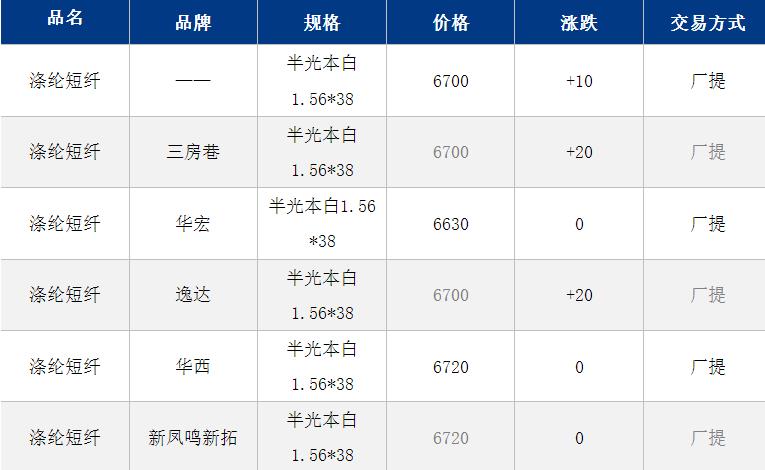 1.4D半光直紡滌綸短纖江浙商談重心6600-6850元/噸出廠或短送,福建主流商談6750-6850元/噸現(xiàn)款短送,山東、河北主流6750-6950元/噸送到。