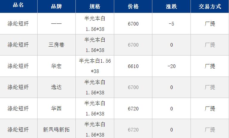 1.4D半光直紡滌綸短纖江浙商談重心6600-6900元/噸出廠或短送,福建主流商談6950-7000元/噸現(xiàn)款短送,山東、河北主流6700-7000元/噸送到。