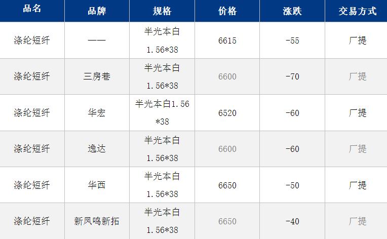1.4D半光直紡滌綸短纖江浙商談重心6500-6750元/噸出廠或短送,福建主流商談6650-6750元/噸現(xiàn)款短送,山東、河北主流6600-6900元/噸送到。
