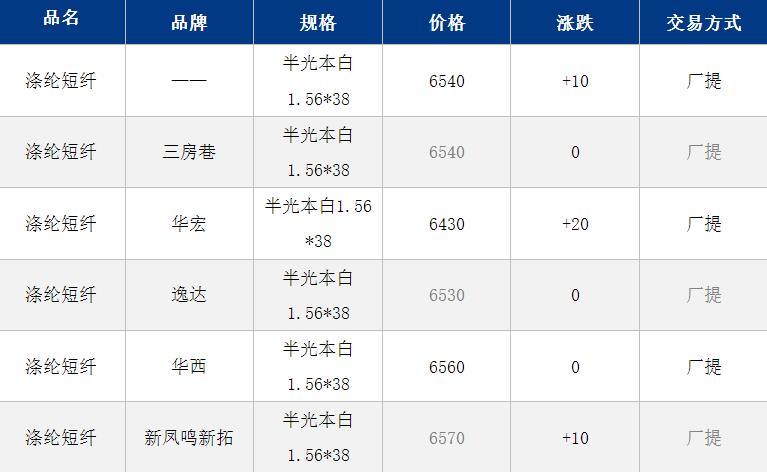 江蘇滌綸短纖現(xiàn)貨價格上漲10元在6540元/噸;早間江蘇主流商談6520-6580元/噸自提,偏低貨源6430元/噸附近。