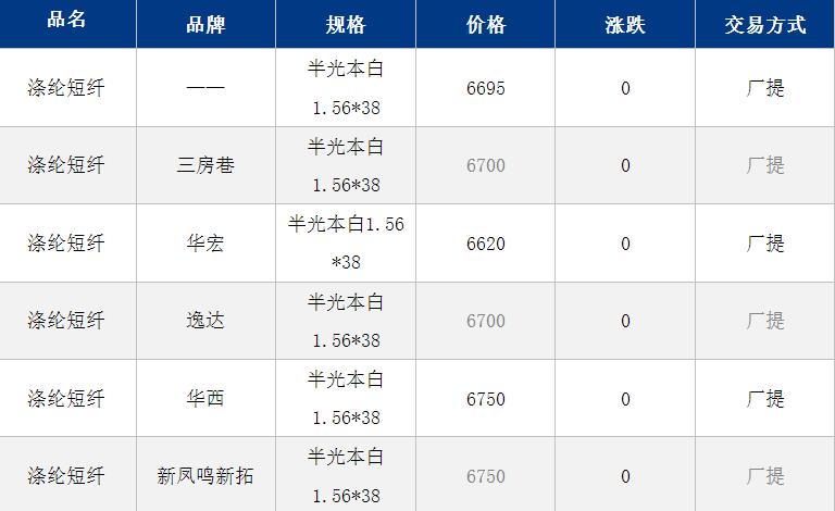 1.4D半光直紡滌綸短纖江浙商談重心6650-6850元/噸出廠或短送,福建主流商談6950-7000元/噸現(xiàn)款短送,山東、河北主流6750-6900元/噸送到。