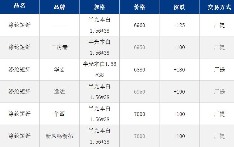 1.4D半光直紡滌綸短纖江浙商談重心6850-7050元/噸出廠或短送,福建主流商談7100-7200元/噸現(xiàn)款短送。