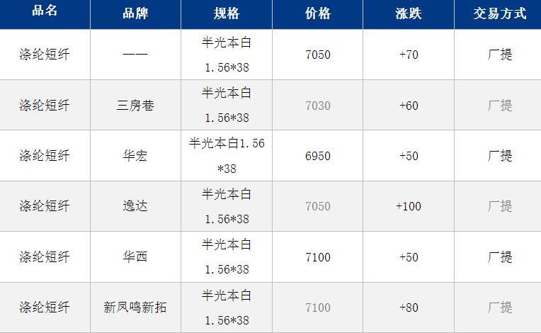 1.4D半光直紡滌綸短纖江浙商談重心6950-7100元/噸出廠或短送,福建主流商談7250-7400元/噸現(xiàn)款短送,山東、河北主流7050-7250元/噸送到。