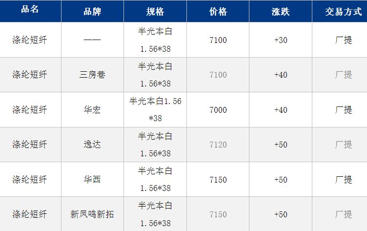1.4D半光直紡滌綸短纖江浙商談重心7000-7200元/噸出廠或短送,福建主流商談7250-7400元/噸現(xiàn)款短送,山東、河北主流7150-7350元/噸送到。