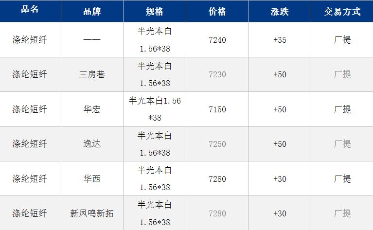 1.4D半光直紡滌綸短纖江浙商談重心7150-7350元/噸出廠或短送,福建主流商談7500-7600元/噸現(xiàn)款短送,山東、河北主流7300-7500元/噸送到。