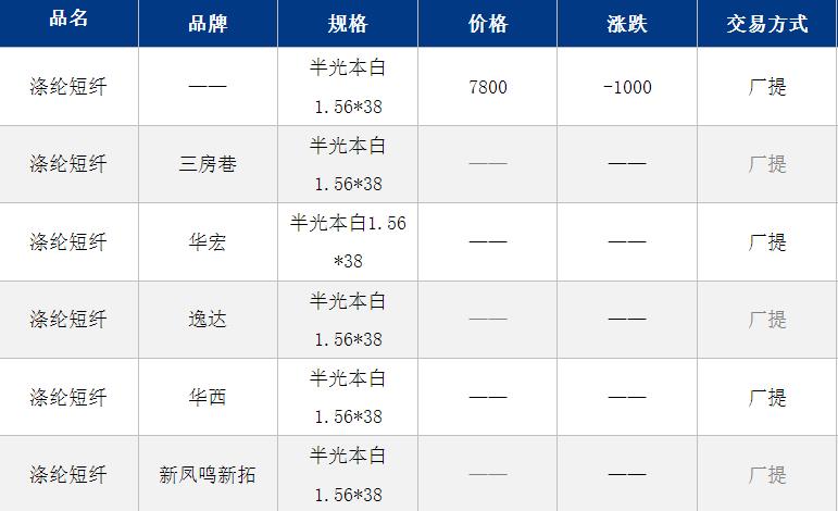 1.4D半光直紡滌綸短纖江浙商談重心7600-7900元/噸出廠或短送,福建主流商談8000-8100元/噸現(xiàn)款短送,山東、河北主流7750-8050元/噸送到。