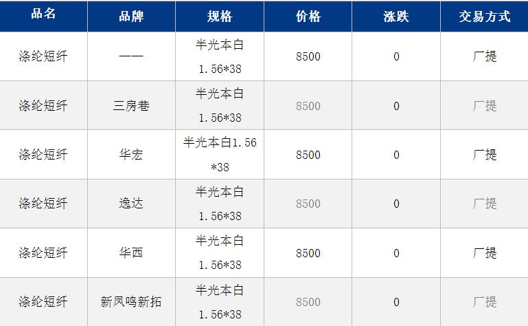 1.4D半光直紡滌綸短纖江浙商談重心8200-8500元/噸出廠或短送,福建主流商談8400-8700元/噸現(xiàn)款短送,山東、河北主流8350-8650元/噸送到。