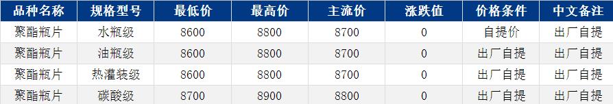 華東聚酯瓶片收于8700元/噸,漲跌值0元/噸,原料明顯回調(diào),支撐不足。然而聚酯瓶片流通貨源緊張,工廠集體暫時(shí)封盤,重心僵持整理。部分持貨商報(bào)盤8600-8800元/噸,無(wú)實(shí)單遞盤。下游及貿(mào)易商提貨為主,交投清淡。