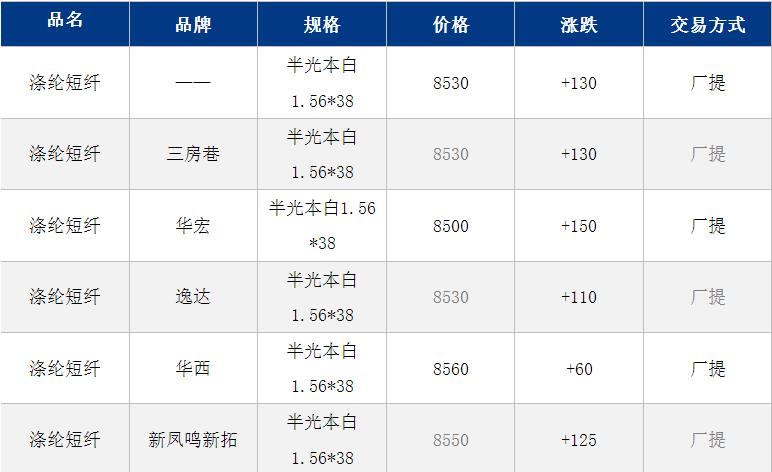 1.4D半光直紡滌綸短纖江浙商談重心8400-8600元/噸出廠或短送,福建主流商談8500-8700元/噸現(xiàn)款短送,山東、河北主流8600-8750元/噸送到。