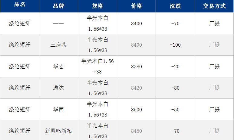 1.4D半光直紡滌綸短纖江浙商談重心8300-8600元/噸出廠或短送,福建主流商談8450-8700元/噸現(xiàn)款短送。