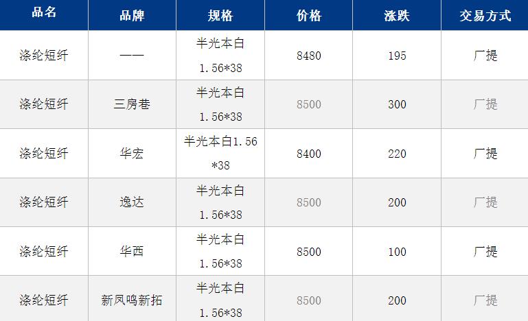 1.4D半光直紡滌綸短纖江浙商談重心8450-8600元/噸出廠或短送,福建主流商談8500-8700元/噸現(xiàn)款短送,山東、河北主流8600-8750元/噸送到。