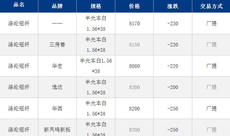 1.4D半光直紡滌綸短纖江浙商談重心8000-8500元/噸出廠或短送,福建主流商談8200-8700元/噸現(xiàn)款短送,山東、河北主流8150-8600元/噸送到。