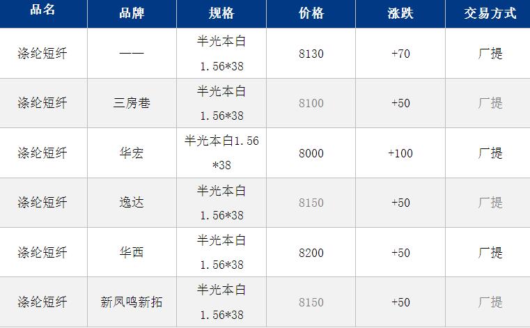 1.4D半光直紡滌綸短纖江浙商談重心8100-8400元/噸出廠或短送,福建主流商談8500-8600元/噸現(xiàn)款短送,山東、河北主流8250-8550元/噸送到。