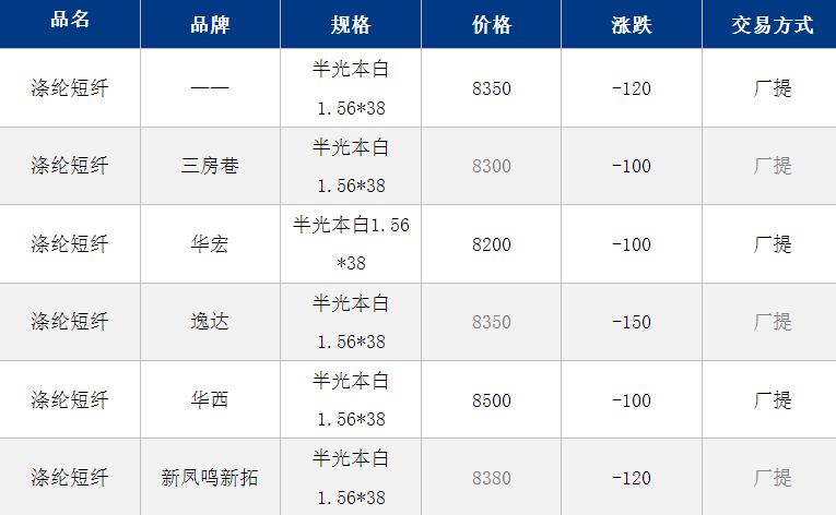 1.4D半光直紡滌綸短纖江浙商談重心8250-8700元/噸出廠或短送,福建主流商談8200-8700元/噸現(xiàn)款短送,山東、河北主流8350-8800元/噸送到。