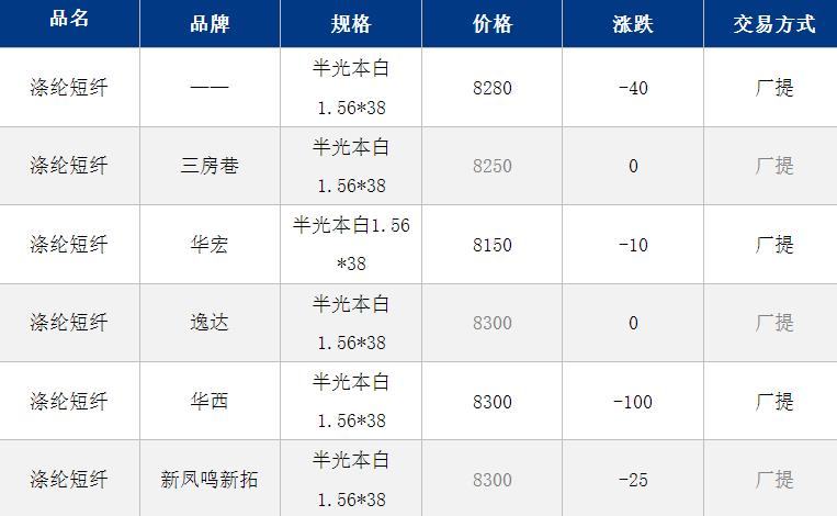 1.4D半光直紡滌綸短纖江浙商談重心8200-8700元/噸出廠或短送,福建主流商談8200-8700元/噸現(xiàn)款短送,山東、河北主流8300-8750元/噸送到。