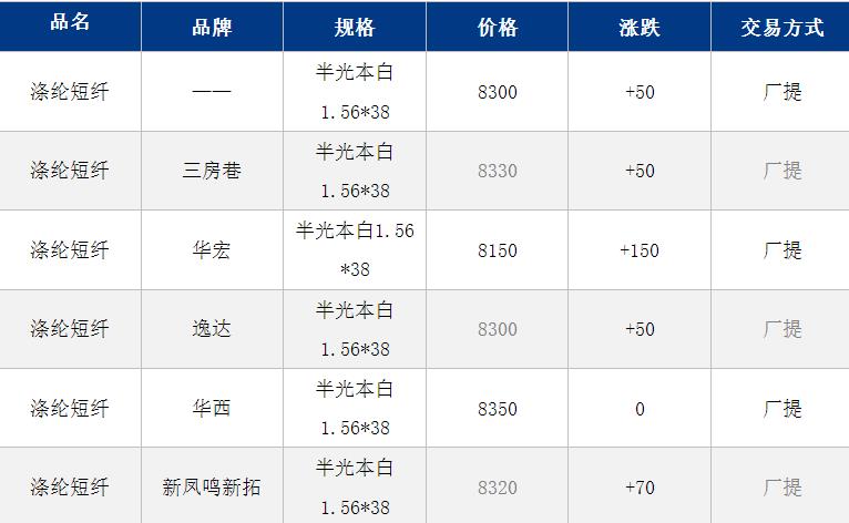 江蘇滌綸短纖現(xiàn)貨估價暫時上漲50元到8300元/噸;早間短纖現(xiàn)貨估價商談參考8250-8350元/噸,偏低8150元/噸附近自提。