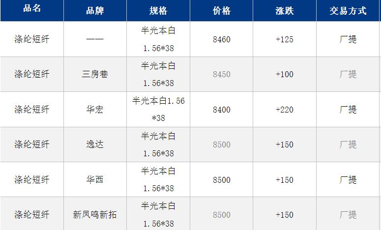 1.4D半光直紡滌綸短纖江浙商談重心8500-8550元/噸出廠或短送,福建主流商談8350-8500元/噸現(xiàn)款短送,山東、河北主流8500-8650元/噸送到。