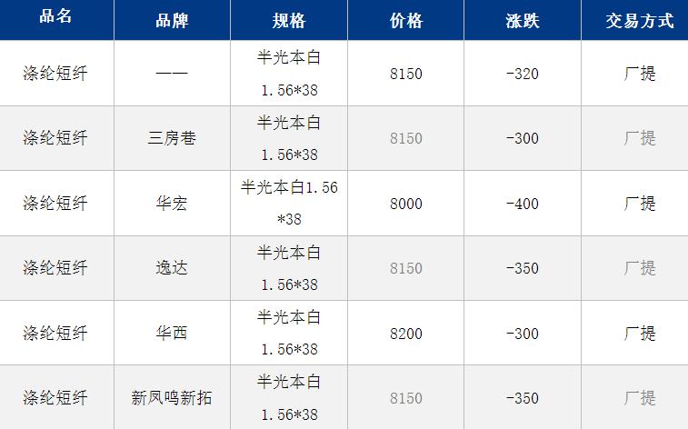 1.4D半光直紡滌綸短纖江浙商談重心8400-8450元/噸出廠(chǎng)或短送,福建主流商談8300-8400元/噸現(xiàn)款短送,山東、河北主流8150-8450元/噸送到。