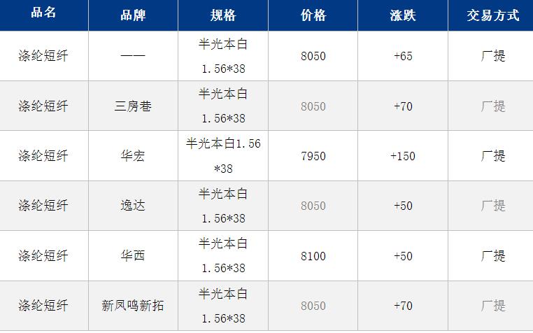 1.4D半光直紡滌綸短纖江浙商談重心7950-8400元/噸出廠或短送,福建主流商談7950-8350元/噸現(xiàn)款短送,山東、河北主流8050-8500元/噸送到。