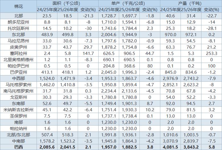 2025/26年度巴西棉花單產(chǎn)預(yù)估為1882.50千克/公頃,同比減少3.8%,上一年度為1956.99千克/公頃。