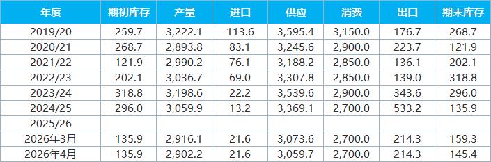 以下為巴西棉花供需平衡表(單位:千噸)