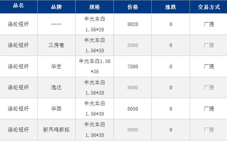 1.4D半光直紡滌綸短纖江浙商談重心7900-8400元/噸出廠或短送,福建主流商談7950-8350元/噸現(xiàn)款短送,山東、河北主流8100-8500元/噸送到。