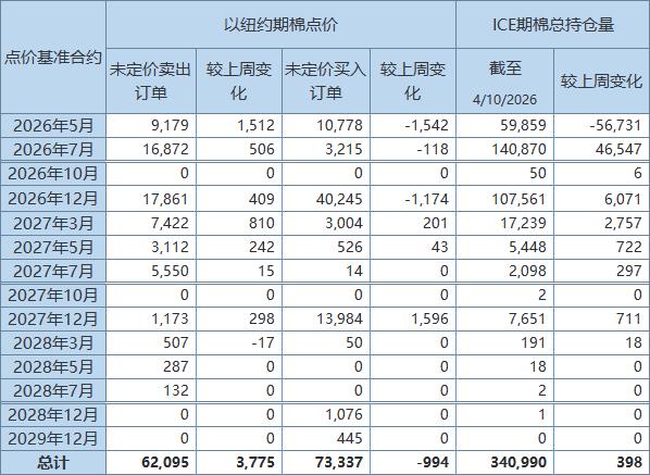 4月16日(周四),美國商品期貨交易委員會(huì)(CFTC)周四公布,截至4月10日,以ICE期棉2026年5月合約點(diǎn)價(jià)未定價(jià)賣出訂單(UnfixedCallSales)較前周增加1512手至9179手。