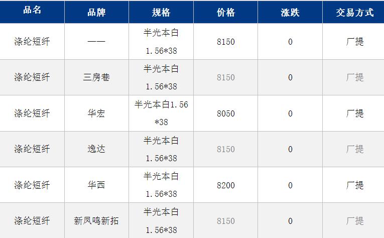 1.4D半光直紡滌綸短纖江浙商談重心8150-8400元/噸出廠或短送,福建主流商談8150-8350元/噸現(xiàn)款短送,山東、河北主流8200-8550元/噸送到。