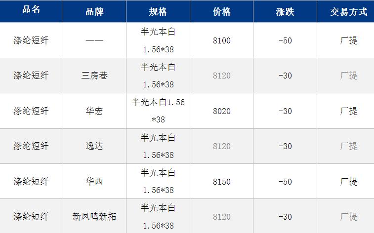 江蘇滌綸短纖現(xiàn)貨估價下跌50元至8100元/噸;早間短纖現(xiàn)貨商談參考8100-8150元/噸,偏低8000-8030元/噸。