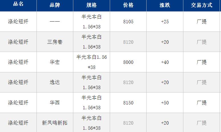 江蘇滌綸短纖現(xiàn)貨估價上漲25元至8105元/噸;盡管下游表現(xiàn)較弱,但原料端供應(yīng)收緊下總體表現(xiàn)較強,短纖價格在自身加工費低位及工廠減產(chǎn)逐步落地下也高位堅挺;目前短纖現(xiàn)貨商談參考8050-8150元/噸,偏低8000元/噸附近。