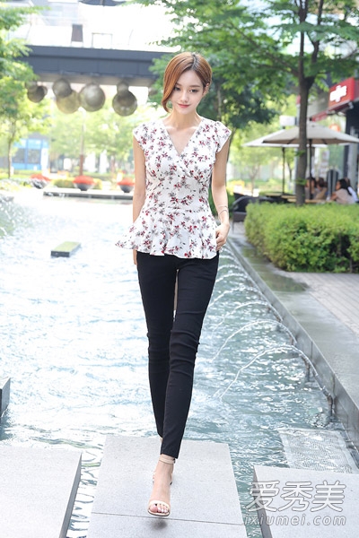 白色雪紡衫點綴著紅色小碎花,清新十足,v領(lǐng)設(shè)計,修身款式,勾勒優(yōu)美曲線,盡顯迷人女性魅力,裙擺式設(shè)計顯得腰身更纖細,精致復(fù)古,配黑色小腳褲知性利落。