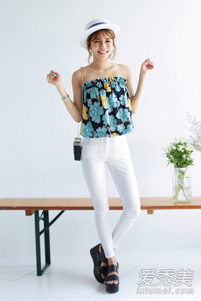 抹胸款式的印花雪紡衫,秀出香肩鎖骨,甜美又性感,藍色和黃色的花朵清新而明媚,真是讓人心曠神怡,搭配白色小腳褲更添清新。