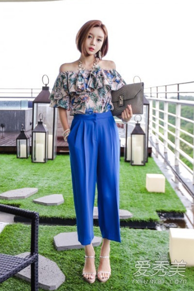 印花雪紡衫一字肩加荷葉邊設(shè)計,性感而柔美,華麗的印花盡顯古典高貴,搭配寶藍色高腰褲,闊腿設(shè)計,時髦大氣,穿出知性干練,增添氣場。