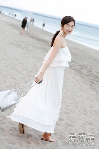 抹胸款的白色連衣裙,上身采用層疊的荷葉邊設計,輕盈又柔美,讓胸部看著更加豐滿,長長的裙擺飄逸唯美,仙范十足。